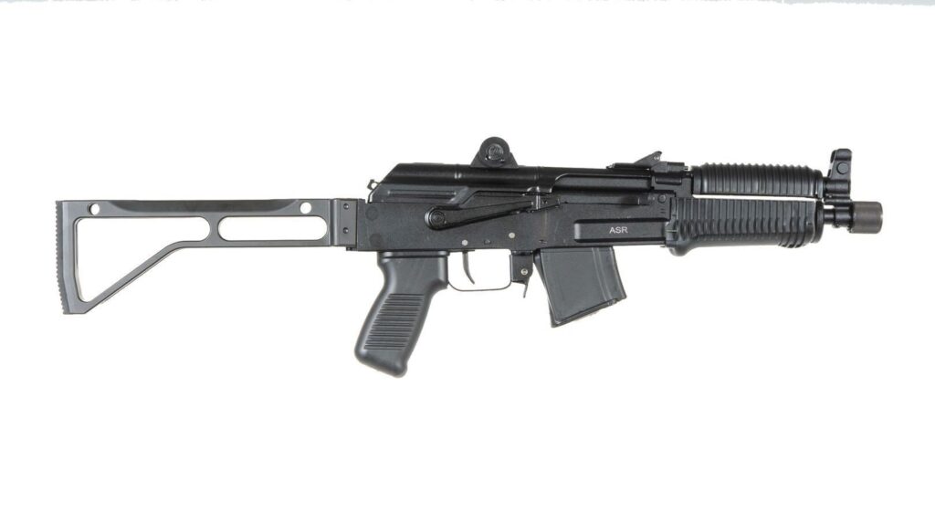 Arsenal Suppressor Ready SAM7K SBR 7.62x39mm semi-automatic short barrel rifle milled receiver 8.5" cold hammer forged chrome lined barrel threaded front sight block (standard Krink configuration with 24x1.5mm RH threads) CNC machined aluminum tactical buttstock assembly 1913 Picatinny attachment with ergonomic ambidextrous cheek rest 4 QD ports and rubber pad. Includes FIME enhanced fire control group sling cleaning kit cleaning rod oil bottle thread protector and 10rd magazine. Available in Black (SAM7K-28ASR) OD Green (SAM7K-28GASR) Plum (SAM7K-28PASR) FDE (SAM7K-28FDEASR) and Gray (SAM7K-28GYASR). Color variations include handguards pistol grip buttstock and 10rd magazine. SAM7K-28GASR includes green sling other models come with a black sling.