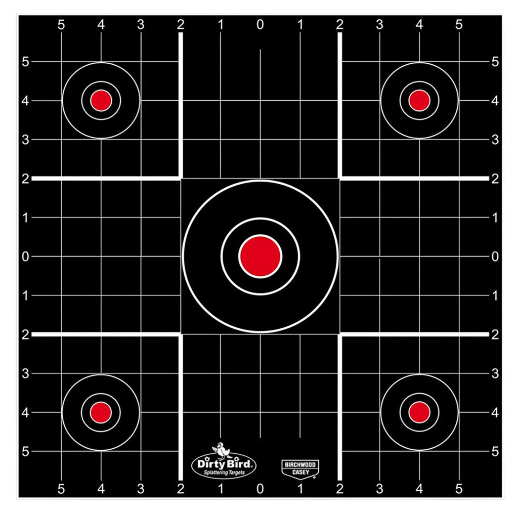 The Dirty Bird Sight-In Target name comes from the splatter of white that appears upon bullet impact, which allows you to immediately spot each shot. It is a great value and simple to use both indoors and outdoors. The non-adhesive back also allows you to affix to a surface as you wish, add notes and then easily save the targets for future reference.