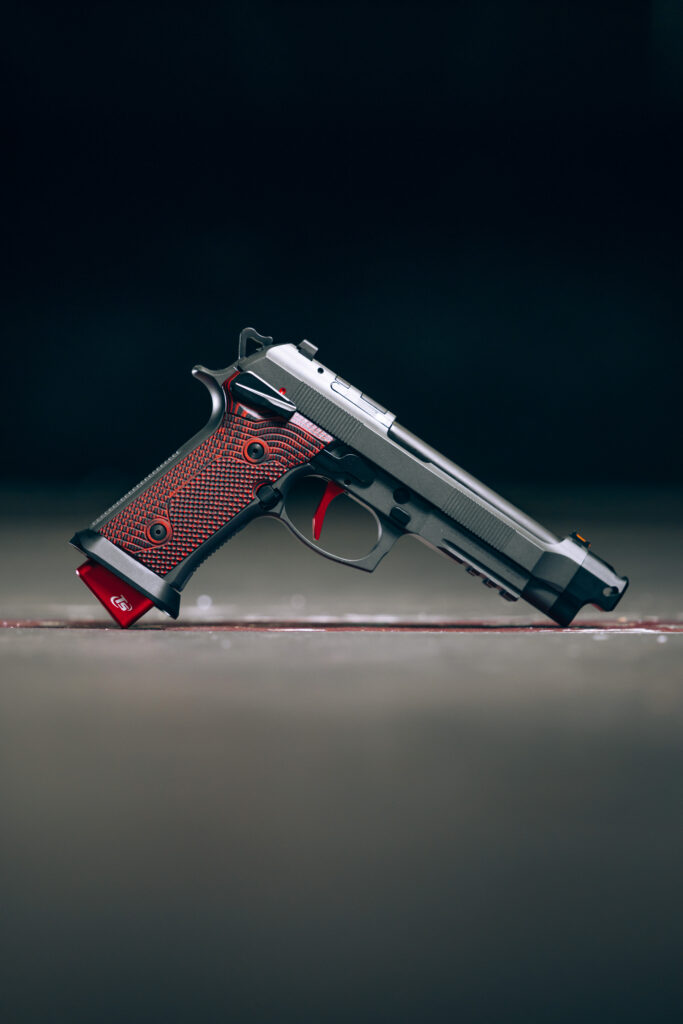 grip and effortless magazine changes under pressure. Adorned with striking LOK Grips in red and black G10 grip panels and a vibrant red Beretta 92 series match aluminum trigger, the Gara exudes style and substance. Featuring a competition self-locking disassembly lever and a Toni System Magwell for ease of maintenance and customization, the Gara is designed to dominate the competition. Equipped with three magazines boasting +4 rounds base pads, for a total capacity of 22 rounds, and a single-port Toni System Compensator to reduce recoil and muzzle rise, the Gara ensures