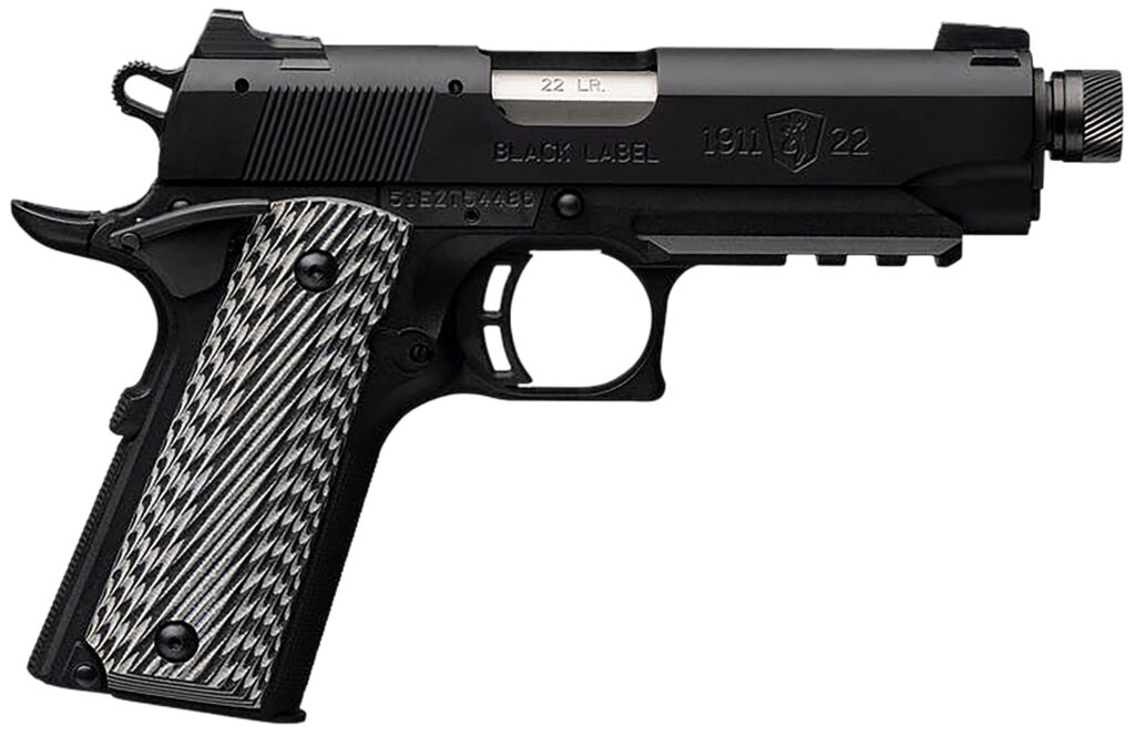 Browning 051821490 1911-22 Black Label Compact SR 22 LR 10+1 4.25" 3.50" Threaded Barrel, Matte Black Serrated Steel Slide & Polymer Frame w/Picatinny Rail & Beavertail, Black/Gray Textured G10 Grips