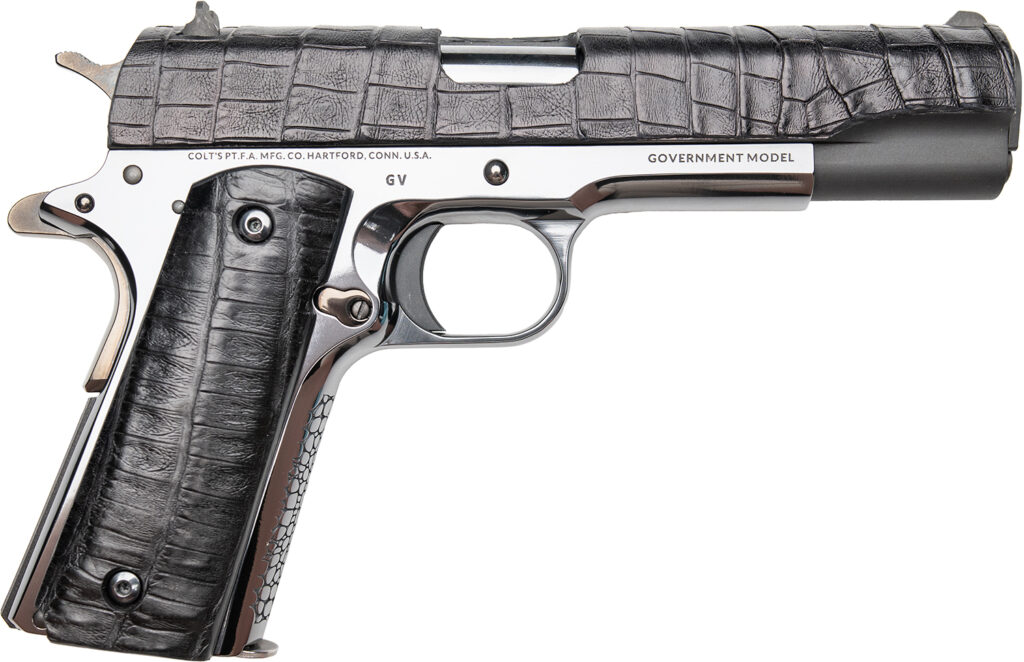 The Colt 1911 Gator marries modern design with authentic materials. Its sleek black DLC finish delivers a bold, contemporary look, while both the slide and grips are wrapped in genuine black alligator leather creating a luxurious aesthetic. At the forefront, the pistol is crowned with a diamond front sight, a striking detail that marks it a true showpiece. The DLC frame is further enhanced with scaled engraving on the magwell, adding depth, texture and artistry to its design. Only 300 sequentially numbered units produced, this release represents a unique opportunity for collectors. Includes a Custom & Collectable Firearms challenge coin and a certificate of authenticity signed by the owner of Custom & Collectable Firearms.