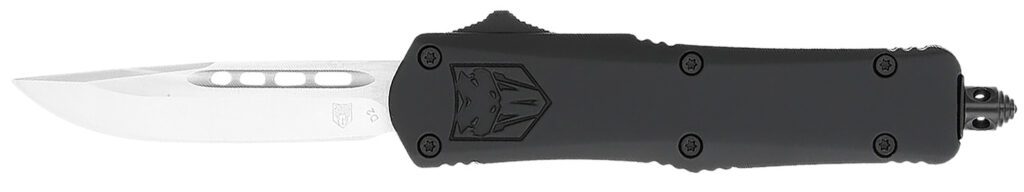 The small FS-3 starts from an aluminum alloy handle and features a D2 steel blade. All knives are dual action (blade deployment and retraction are powered by pushing or pulling the same control switch). The knife is ambidextrous as the pocket clip can be switched to either side. Includes a pocket clip, a glass breaker for emergencies and a nylon sheath.