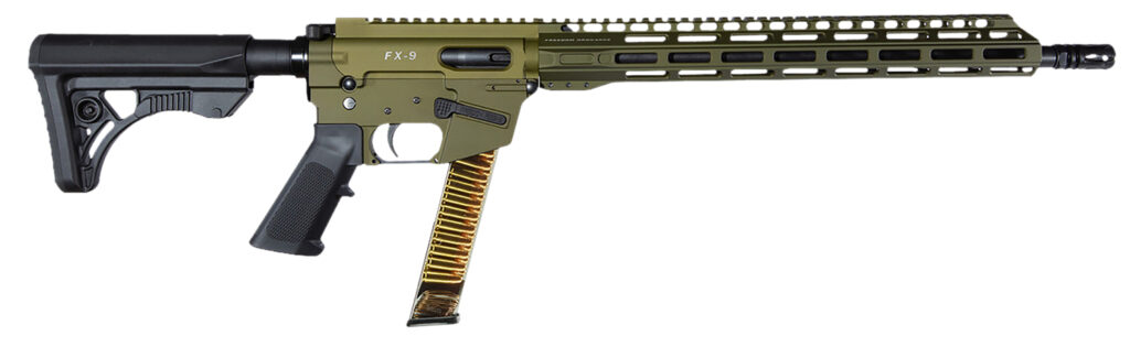 The FX9R tactical rifle features a 16" 9mm Luger barrel; Elite welded/pinned muzzle brake; 13.50" MLOK rail w/4 QD sling points; BCM Barrel nut assembly; B5 furniture- stock, p-grip, rail covers; AFG; Warhammer charging handle.