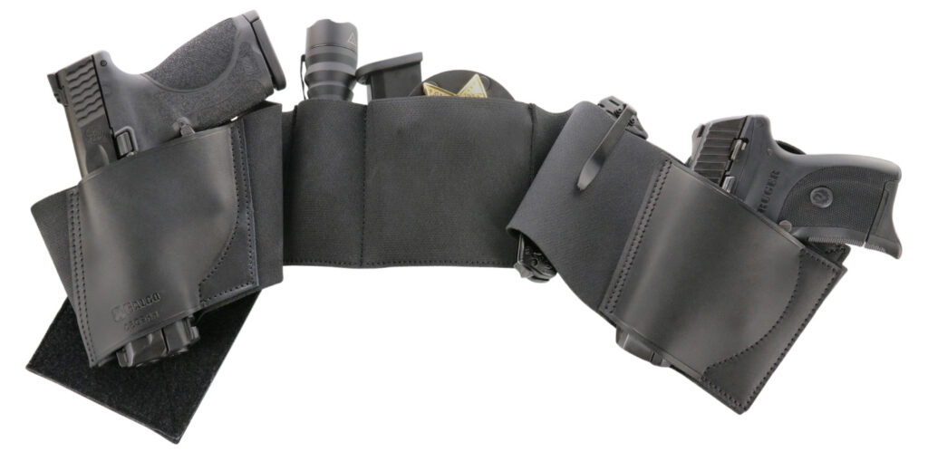 Galco's traditional belly band allows concealed carry of multiple weapons and accessories around the midsection, in an infinite variety of configurations. The UnderWraps also enables the user to make instant additions and changes to the carry rig. Two leather holster pockets facilitate stable positioning of one or two firearms simultaneously, while two accessory pockets accommodate badge, cuffs, ammo, etc. The UnderWraps can be worn like a traditional belly band (low on the waistline, partially under the beltline or just above it) or it can be worn around the torso's mid-section (around the solar plexus area). The UnderWraps accommodates both right and left hand draw, strongside, crossdraw and appendix carry, with butt-forward and barrel-forward cants.