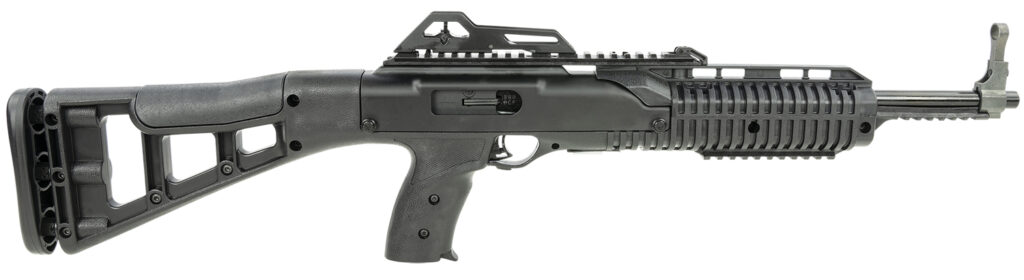 Hi-Point's 3895TS 380 ACP carbine has an all-weather, polymer skeletonized stock with an internal recoil buffer, multiple Weaver-style rails, a sling, swivels, and scope base. It has a quick on/off thumb safety, grip-mounted clip release, last round lock open feature, and fully adjustable sights (post front, peep rear). The 3895TS carbine has a 16.5" barrel for an OAL of 31". Hi-Point produces affordable, American-made firearms featuring 100% American parts and assembly. Hi-Point carbines are +P rated and accept all factory ammunition. This model has a black stock with black metal finish and includes a 10-round magazine. (The mag is not compatible with CF380)