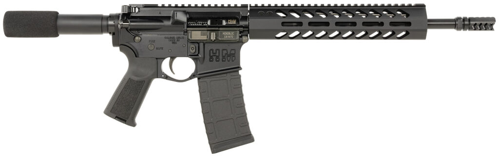 The RaiderMC 556 SBR pistol features a threaded, match grade Monobloc barrel with an integrally machined gas block; 10.38" free floating Picatinny rail; forged aluminum upper and lower receivers; M16 bolt carrier group including charging handle and buffer tube/spring; custom trigger guard; Monobloc ejection port cover; custom QD end plate' and HD Defense adjustable Close Quarter (CBQ) stock and enhanced grip. Includes magazine.