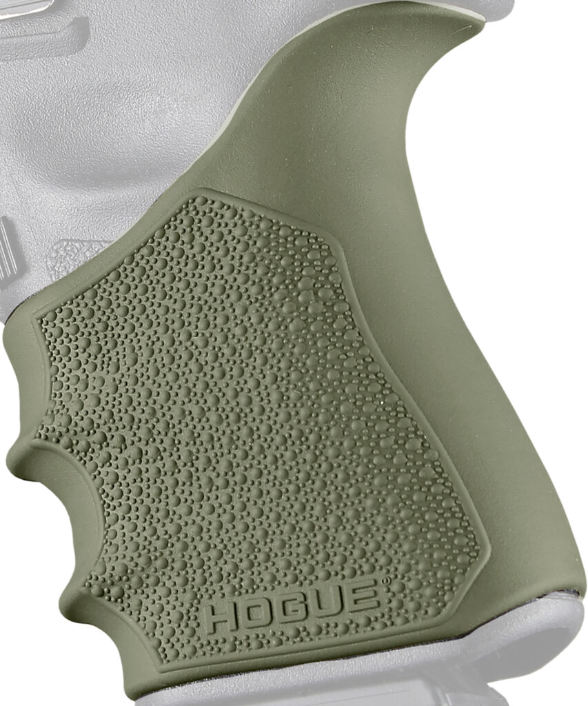 Gentle palm swells fit comfortably in hand. Finger grooves naturally position fingers for optimal grip. Textured with Cobblestone pattern for increased comfort and grip. Beavertail cushions the hand on recoil and offers increased hand comfort higher on the grip. Made from long lasting durable thermoplastic elastomer.