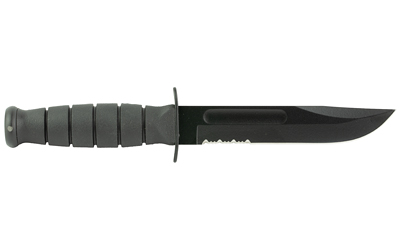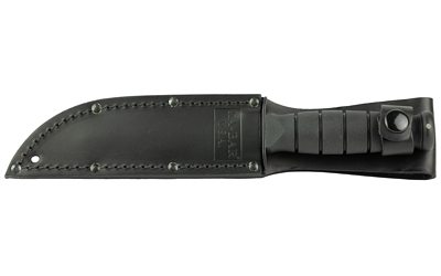 This knife is a practically sized fixed blade knife that features a non-slip handle. A partially serrated edge makes cutting looped and synthetic materials a breeze. Tang stamped USA. Leather sheath included.