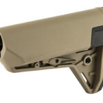 The storage-capable version of the flagship Magpul MOE SL carbine stock, the MOE SL-S (Storage) Stock is a direct replacement buttstock for AR15/M4 carbines. The sleek profile, dual-side release latches, and waterproof battery tubes make it the slimmest storage tube stock available. The SL-S provides an enhanced cheek weld and true, O-ring sealed, 10m waterproof storage area desired by many, but fits it into the narrowest package possible to allow a more upright head position and minimize bulk. A rolled toe and angled rubber butt-pad are optimized for use with body armor, and an ambidextrous QD sling swivel socket is included. A unique leaf-spring tension system provides a solid fit on mil-spec receiver extensions, with slightly less friction than the original SL. The MOE SL-S is the most intuitive, comfortable, and efficient storage stock available. Made in U.S.A.