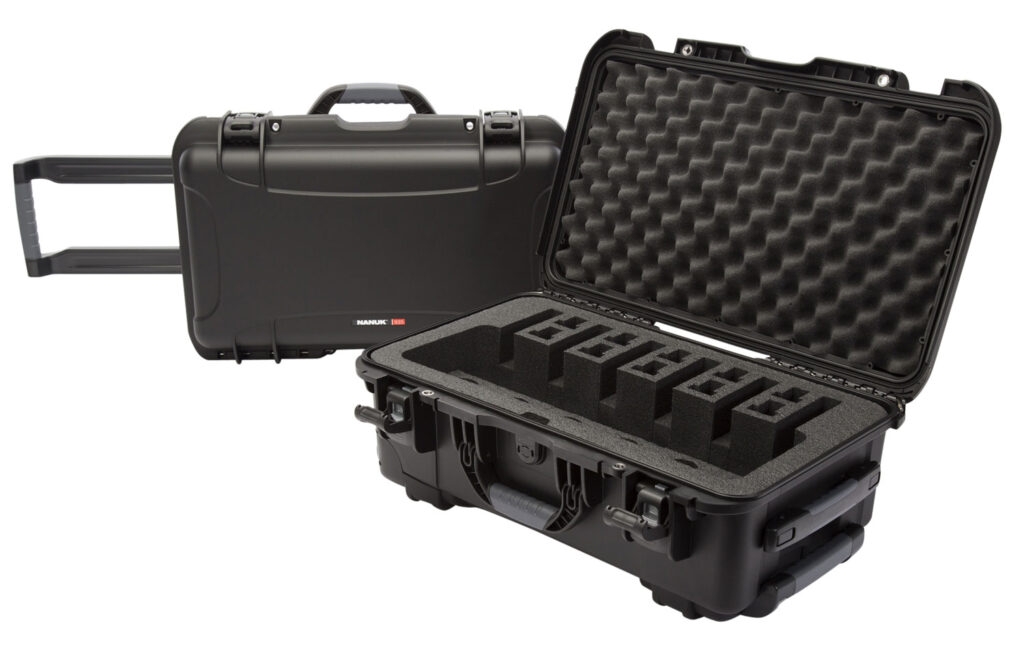 The 6 Up Pistol case provides secure storage for up to 6 handguns and 10 single or double stack magazines. Perfect for law enforcement, military and gun enthusiasts, this case features resistant closed cell PEF foam construction for long term performance. The case will also accept 1911 style guns and accommodate guns fitted with trigger locks. With 2 reinforced eyelets for locking, you can store, secure and transport your expensive handguns with confidence. Polyurethane wheels and a one touch pull handle make transportation easy and convenient. The center foam insert can be removed to reconfigure the case for 4 handguns with a storage area for accessories.