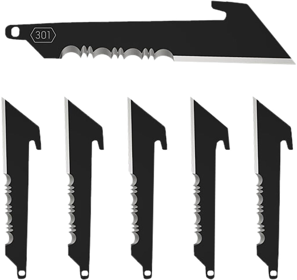 Set of six 3" serrated utility replacement blades. Perfect for hunting, work and everyday carry. Each blade comes sealed in a plastic pouch with PVC blade cover to protect the blade from the elements and to improve safety when transporting and changing blades.