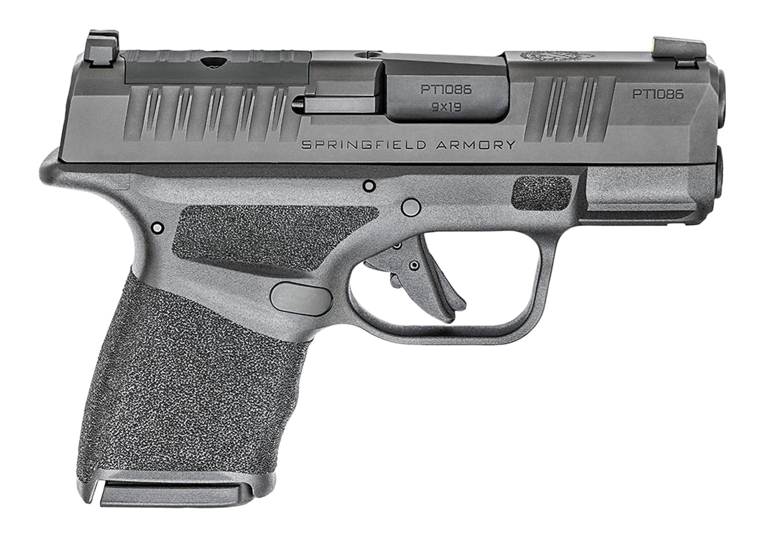 Springfield Armory micro-compact Hellcat features unique top slide serrations to maximize your grip on the slide; non-proprietary accessory rail allows you to accessories with your favorite light and/or laser; Tritium/Luminescent front sight, Tactical Rack U-Notch rear sight; reversible mag release, loaded chamber indicator and custom pressure activated grip texture. Includes 2 magazines and case.
