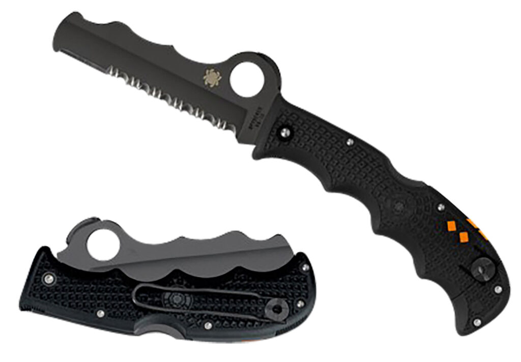 We named this knife after its principal job function, to assist. The Spyderco Assist Black Blade is a lightweight folder for emergency fire/rescue professionals and the well-equipped citizen who rely on knives to be straightforward in use and perform flawlessly. The blade is coated in non-reflective black carbon nitride with a patented lift-and-pry (blunt-nose) shape made from high-carbon VG-10 stainless steel and loaded with teeth. Most of its 3-3/8" cutting edge is serrated with the last inch at the tip left PlainEdged. Above the one-hand-open hole sits a feature called a Cobra Hood. It's a metal cap that guides the thumb over the hole for quick, by-feel opening then doubles as a textured leveraging platform for your thumb during cutting. A wavy pattern cut out of the top of the blade and again along the handle is for controlled rope cutting. By placing a rope in the groove (between the partially open blade and handle) you can squeeze the blade shut, slicing and trimming rope in a controlled movement without fully exposing the cutting edge. The handle is black lightweight fiberglass reinforced nylon with a survival whistle built into the butt end, shrill and high-pitched enough to get you noticed. A reinforced wire pocket clip attaches through the handle on either side for left- or right-hand use. A retractable and replaceable carbide-tip glass/ice breaker is housed inside the handle and is exposed when the closed blade is squeezed into the handle, retracting when pressure is released.